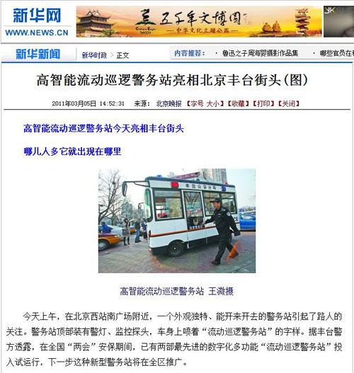 新華網(wǎng)報(bào)道 高智能流動(dòng)警務(wù)室巡邏車圖)
