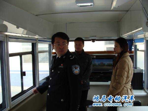 這兩臺5.5米的流動警務(wù)室是在電動汽車的基礎(chǔ)上又經(jīng)鴻馬公司員工的精心設(shè)計而完成的,車上安裝了鴻馬電動汽車公司自主研發(fā)的卡口系統(tǒng),具有對車輛進行違章查詢,車流統(tǒng)計等功能,同時車上安裝有先進的3G傳輸系統(tǒng),車頂加裝的高清視頻探頭能夠全方位實施監(jiān)控,使流動警務(wù)室內(nèi)部工作人員能夠及時掌握周圍治安狀況,并根據(jù)實際情況進行妥善處理。