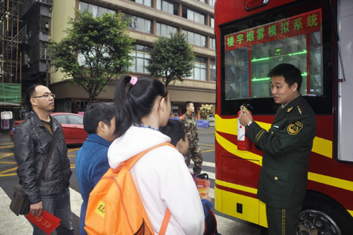 今年11月9日是全國第24個“119”消防宣傳日。為廣泛深入地普及火災(zāi)防范和火場逃生自救知識,11月9日,宜賓翠屏區(qū)消防大隊攜橙袖標(biāo)·正能量消防志愿者走上街頭,為群眾宣講消防安全知識。期間,大隊引進的“消防移動體驗館”也在城區(qū)中山廣場首次亮相,免費向群眾開放參觀、體驗。