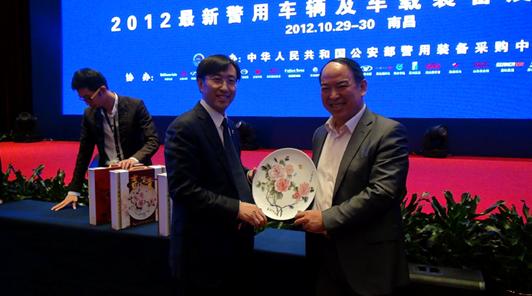 公安部警用裝備采購中心主任王強(qiáng)(左)為鴻馬電動(dòng)車公司總經(jīng)理馬鴻軍頒發(fā)紀(jì)念品