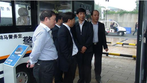 江西省公安廳紀(jì)委書記李煌(左一)參觀鴻馬流動(dòng)警務(wù)室給予好評