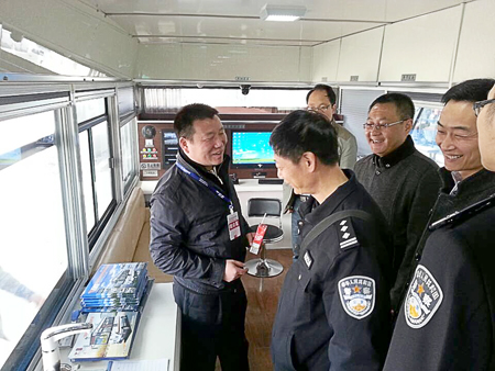 工作人員向江蘇公安領(lǐng)導(dǎo)介紹流動(dòng)警務(wù)室