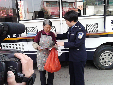 這輛新鮮的車引來了在大街上買東西或者行走著的村民們,很快,“流動(dòng)警務(wù)室”就被大家圍住了。一位老太太顫顫巍巍地走過來詢問警務(wù)人員:這是什么啊?我不認(rèn)識字。是你們公安局幫我們辦事的嗎?警務(wù)人員邊給大家分發(fā)宣傳資料邊解釋說:這是流動(dòng)警務(wù)室,以后會經(jīng)常穿行在村子里、集鎮(zhèn)上,你們要辦理身份證,或者相關(guān)各種業(yè)務(wù)的時(shí)候,就不用跑那么遠(yuǎn)去派出所了,在車上就可以辦理。