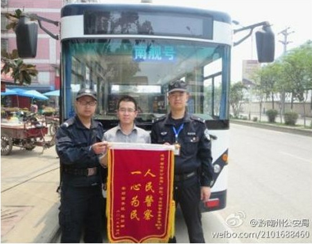 移動(dòng)警務(wù)室上工作民警接受群眾贈(zèng)送錦旗