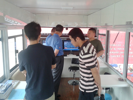 鴻馬工作人員為公安部領(lǐng)導(dǎo)介紹移動警務(wù)室