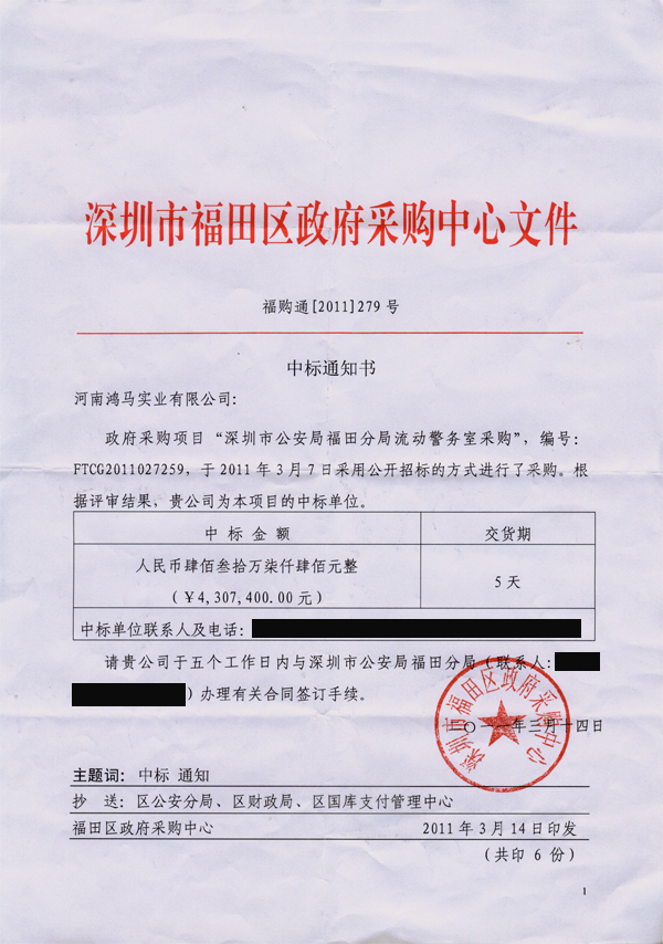 本公司收到深圳市福田區(qū)政府采購(gòu)中心發(fā)出的中標(biāo)流動(dòng)警務(wù)室的通知書,通知本公司中標(biāo)“深圳市公安局福田分局流動(dòng)警務(wù)室采購(gòu)”項(xiàng)目,這次深圳采購(gòu)鴻馬流動(dòng)警務(wù)室,電動(dòng)警務(wù)室、移動(dòng)警務(wù)室,移動(dòng)警亭中標(biāo)價(jià)合計(jì)人民幣4,307,400元。