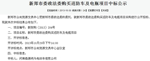 鴻馬電動(dòng)巡邏車(chē)新鄭中標(biāo)公告