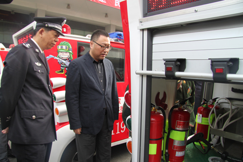 上海虹口區(qū)區(qū)長(zhǎng)曹立強(qiáng)(左一)參觀鴻馬消防宣傳車