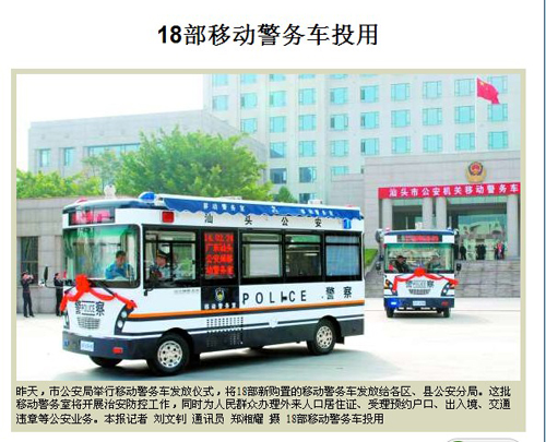 汕頭特區(qū)晚報:十八部鴻馬汽油移動警務室汕頭投用