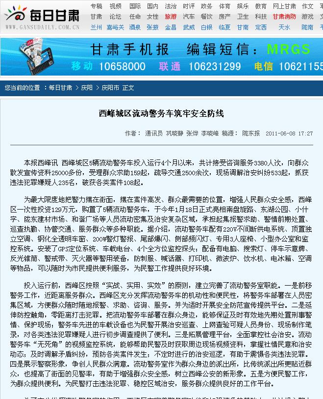 甘肅西峰流動(dòng)警務(wù)室降低發(fā)案率 甘肅每日新聞報(bào)道