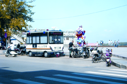 近日,記者在火車站站前廣場、沿江公園建國十周年紀念塔前看到,兩輛嶄新的多功能鴻馬“移動警務室”在此駐扎巡控。