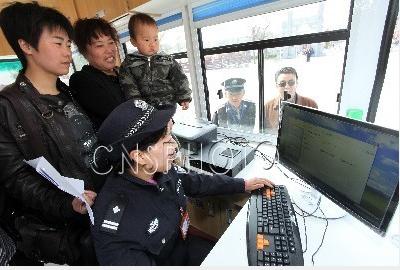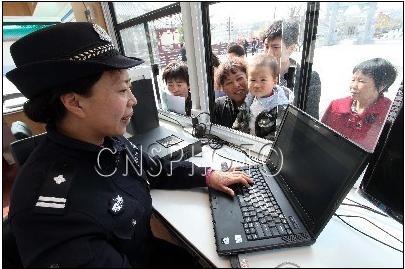 4月12日,河南省許昌市公安局北大派出所民警在流動警務(wù)站里為群眾辦理戶籍手續(xù)。