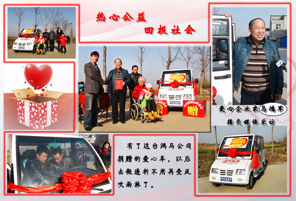 獲悉這個美麗的愛情故事后,森源鴻馬電動汽車總經(jīng)理馬鴻軍安排公司車間為這對80后夫妻量身定做了這臺象征著“最美愛情”的鴻馬新能源電動車,他說:得知洛陽這對年輕80后的愛情故事后很受感動,這項(xiàng)活動非常有意義,希望他們這種愛情觀喚起社會的關(guān)注,此次我們森源鴻馬公司捐贈一臺新能源電動車,希望能陪伴著這對80后夫妻風(fēng)雨同行。近幾年來,鴻馬電動汽車企業(yè)回饋社會,傳遞愛推動社會公益事業(yè),以實(shí)際行動踐行“感恩社會 關(guān)愛他人”。