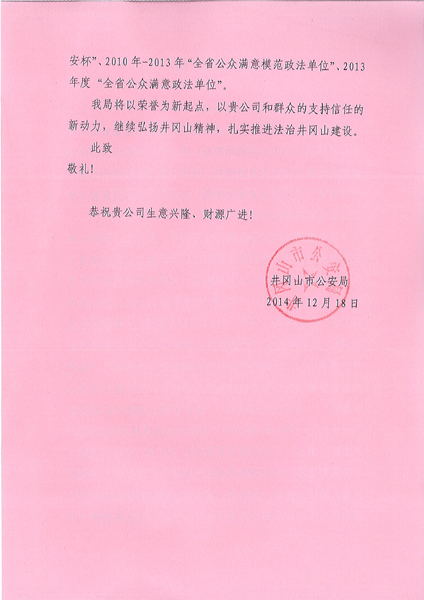 我局將以榮譽(yù)為起點(diǎn),以貴公司和群眾的支持為新動(dòng)力,繼續(xù)弘揚(yáng)井岡山精神,扎實(shí)推進(jìn)法治井岡山建設(shè)。