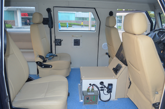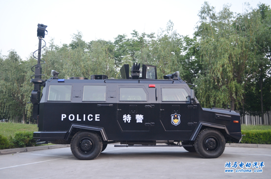 該車外形威猛俊朗,采用復(fù)合防彈防護(hù)工藝而成。車身六面裝甲,整車可防御56式?jīng)_鋒槍彈的沖擊。車身頂部設(shè)有射擊塔,可配備武器系統(tǒng)(包括各類槍支、發(fā)射器等打擊裝備),車身頂部配置了監(jiān)控照明裝備和警燈警示裝備。車內(nèi)配置了車載警用電腦、車載無(wú)線通信系統(tǒng)、近身防御警示系統(tǒng)等警用裝備。
