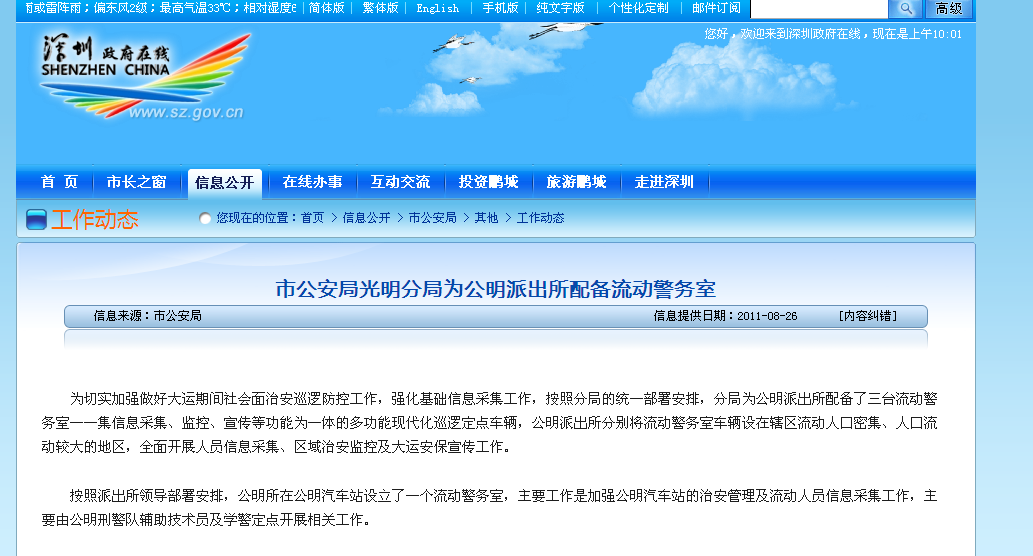 深圳政府在線:報道深圳光明為公明派出“鴻馬流動警務(wù)室”