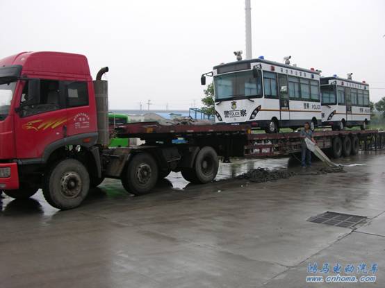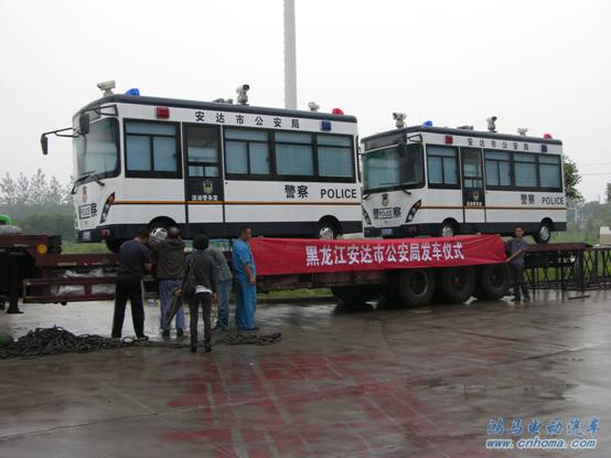 9月5日,天空飄著蒙蒙的細(xì)雨,在森源鴻馬電動汽車研發(fā)中心的廣場內(nèi)停放著兩輛5.5米長的流動警務(wù)室,這是即將發(fā)往黑龍江安達(dá)市公安局的流動警務(wù)室。