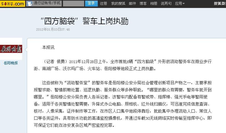 2011年12月28日上午,全市首批6輛“四方腦袋”外形的流動警務(wù)車在商業(yè)步行街、南湖廣場、沃爾瑪廣場、火車站、岳陽樓等地段正式上崗執(zhí)勤。
